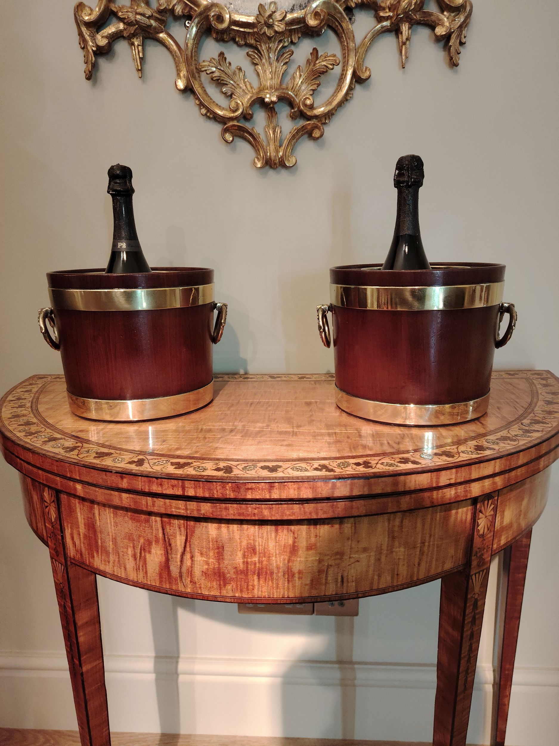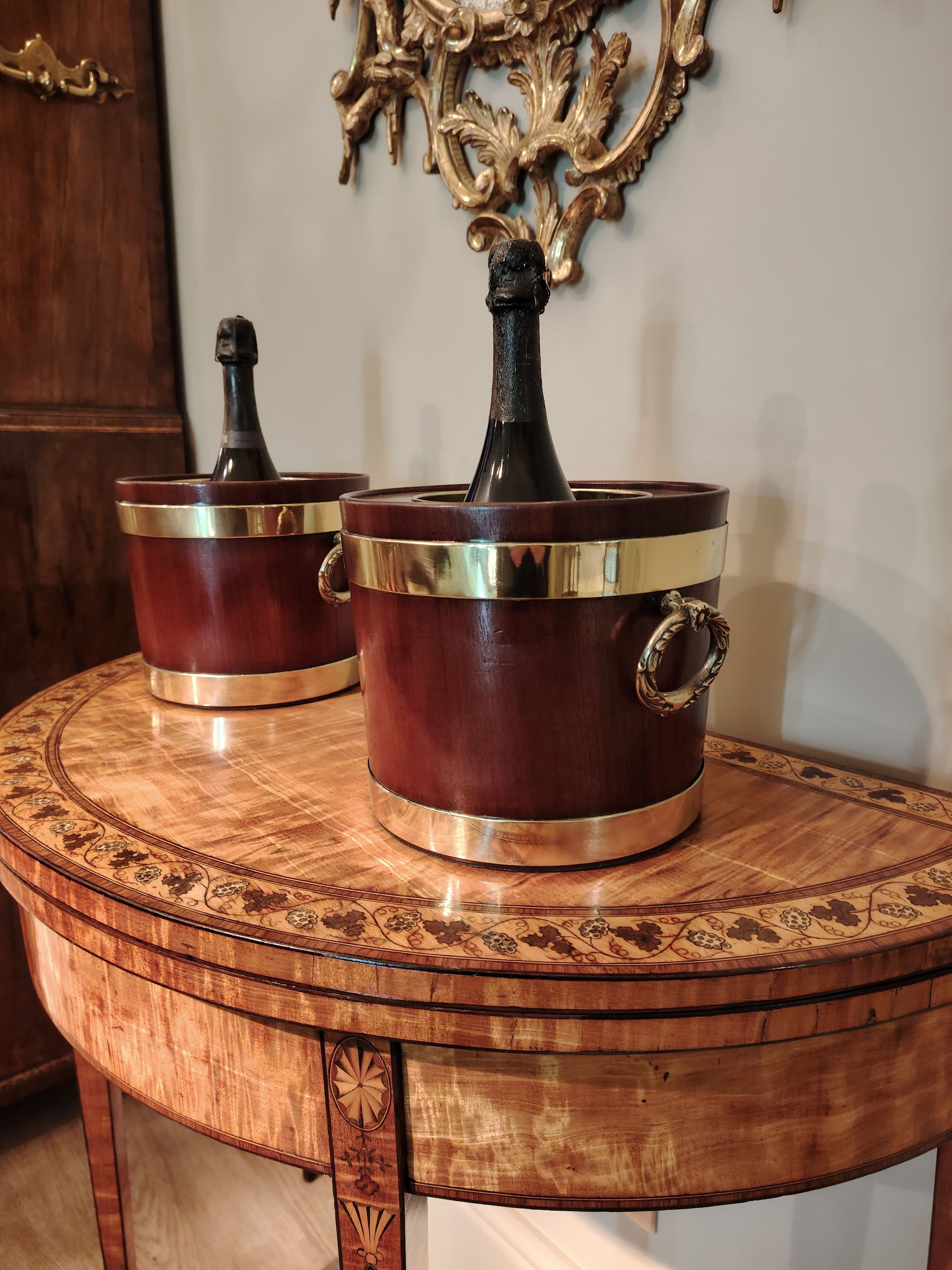 A fine and rare pair of mahogany brass bound bottle or wine table coolers.
